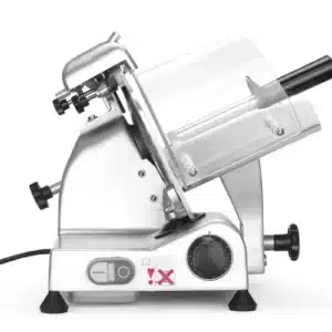 Für professionellen, gewerblichen Einsatz. Gehäuse aus beschichtetem Aluminium, mit rutschfesten Füßen. Schneidmesser aus gehärtetem nichtrostendem Stahl in schräger Stellung. Motor luftgekühlt mit Überhitzungssicherung. Hochleistungsmotor zum Schneiden von Wurstwaren. Die Aufschnittmaschine ist mit Messerschutz und integriertem Messerschärfer ausgestattet. Mit Schutzabdeckung sowie mit Restehalter und senkrechter Sperre. Möglichkeit schneller und einfacher Demontage zur Reinigung. Das Gerät entspricht sämtlichen Sicherheitsanforderungen an Geräte für gewerblichen Einsatz, d.h.: – Durch Einstellung des Drehgriffes auf Schnittbreite ‚0” wird das Messer hinter seinem Schutz gehalten. – Die Aufschnittmaschine ist gegen Betätigung nach der Entfernung des Messerschärfers oder des Achsschutzes abgesichert. – Das Gerät kann nur dann gesperrt und entfernt werden, wenn das Messer auf Schnittbreite ‚0” eingestellt wurde. Zum Schneiden von Käse nicht geeignet. Zum Schneiden von Käse werden die separat erhältlichen teflonbeschichteten Messer benötigt. Messerdurchmesser: 220 mm Stufenlos einstellbare Schnittstärke von 0 bis 12 mm. Maximaler Aufschnittdurchmesser: 150 mm.
