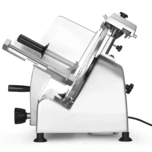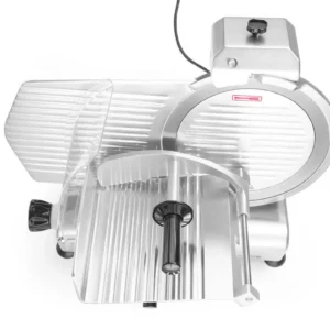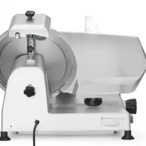 Für professionellen, gewerblichen Einsatz. Gehäuse aus beschichtetem Aluminium, mit rutschfesten Füßen. Schneidmesser aus gehärtetem nichtrostendem Stahl in schräger Stellung. Motor luftgekühlt mit Überhitzungssicherung. Hochleistungsmotor zum Schneiden von Wurstwaren. Die Aufschnittmaschine ist mit Messerschutz und integriertem Messerschärfer ausgestattet. Mit Schutzabdeckung sowie mit Restehalter und senkrechter Sperre. Möglichkeit schneller und einfacher Demontage zur Reinigung. Das Gerät entspricht sämtlichen Sicherheitsanforderungen an Geräte für gewerblichen Einsatz, d.h.: – Durch Einstellung des Drehgriffes auf Schnittbreite ‚0” wird das Messer hinter seinem Schutz gehalten. – Die Aufschnittmaschine ist gegen Betätigung nach der Entfernung des Messerschärfers oder des Achsschutzes abgesichert. – Das Gerät kann nur dann gesperrt und entfernt werden, wenn das Messer auf Schnittbreite ‚0” eingestellt wurde. Zum Schneiden von Käse nicht geeignet. Zum Schneiden von Käse werden die separat erhältlichen teflonbeschichteten Messer benötigt. Messerdurchmesser: 300 mm. Stufenlos einstellbare Schnittstärke von 0 bis 14 mm. Maximaler Aufschnittdurchmesser: 200 mm.