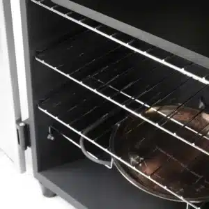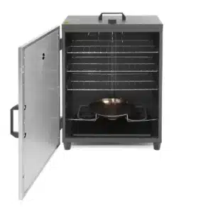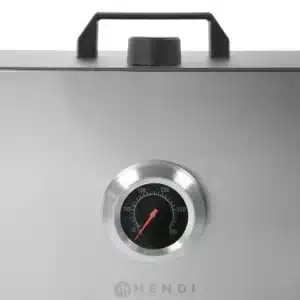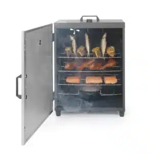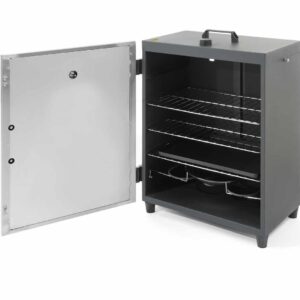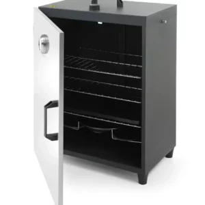 Das Gerät ist ideal zum Räuchern einer Vielzahl von Lebensmitteln wie Fisch, Rindfleisch, Schinken und Gemüse. Aus Edelstahl, mit einer magnetisch schließenden, doppelt isolierten Tür. Temperatur einstellbar mit einem Thermostat, Thermometer in der Tür integriert. Ausgestattet mit einem Heißluftauslass auf der Rückseite. Lieferung mit 3 Gittern (400x279mm) und 3 Fleischhaken.