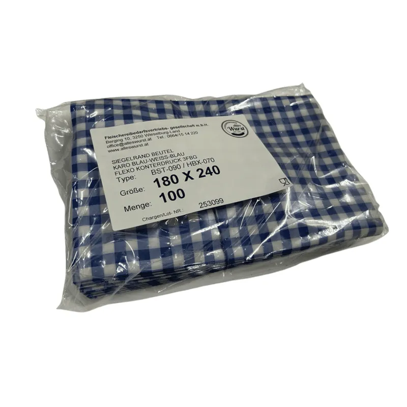 Siegelrandbeutel, Vakuumbeutel 90mµ, blau/weiß kariert/transparent glatt für Vakuum-Kammermaschine
